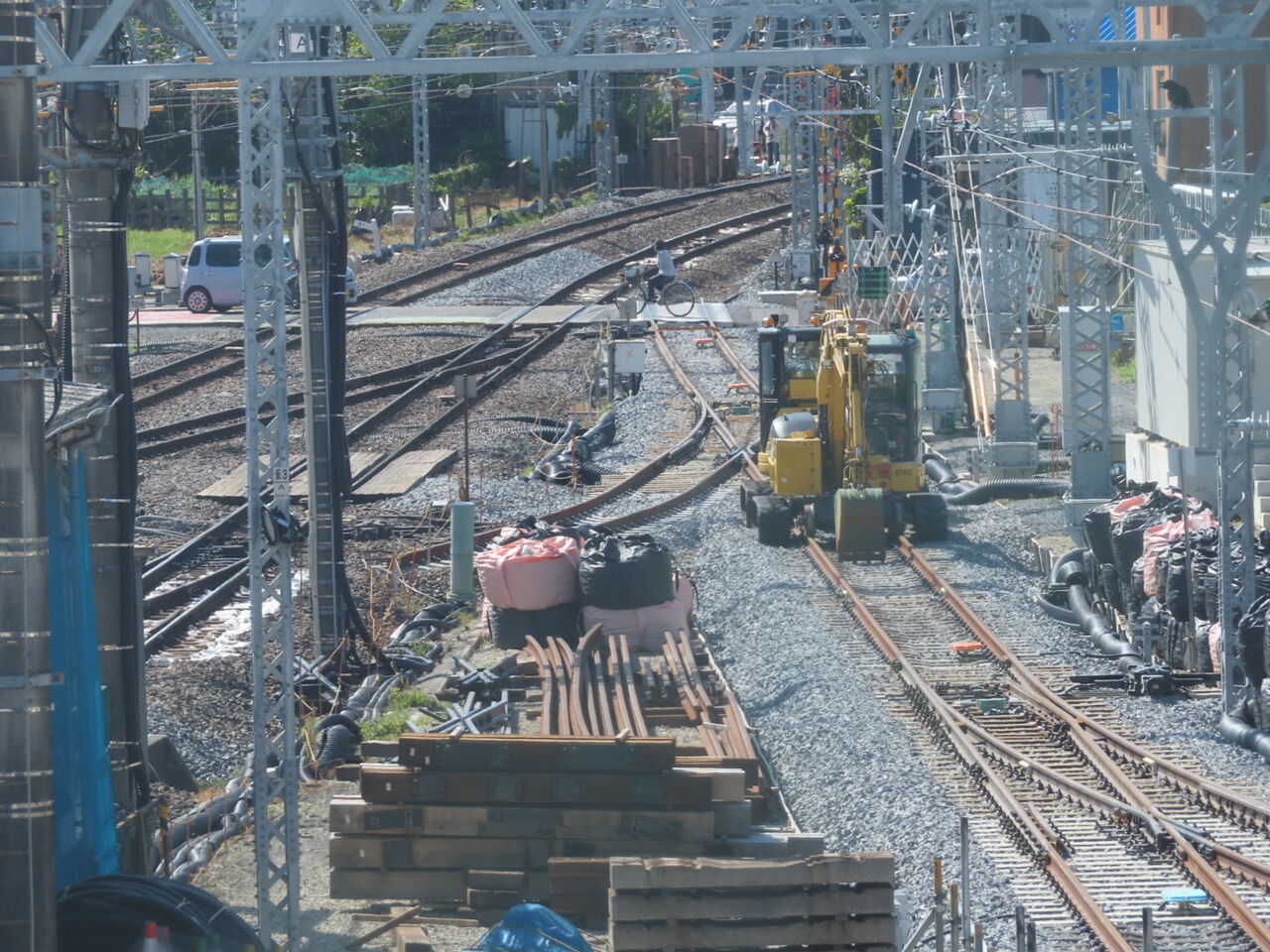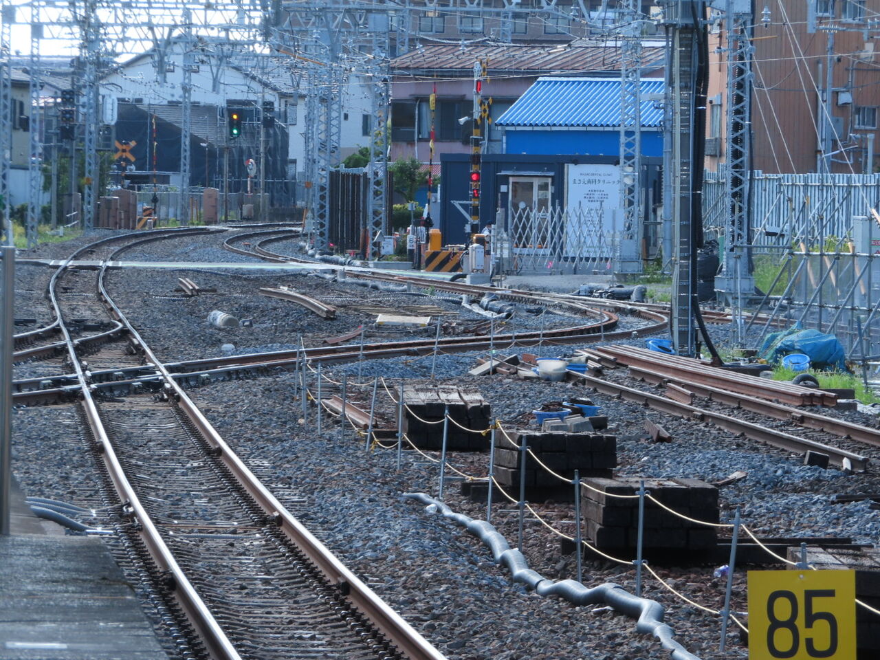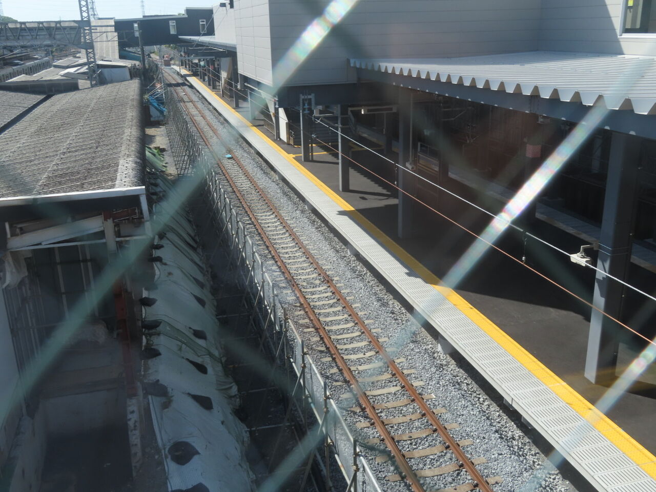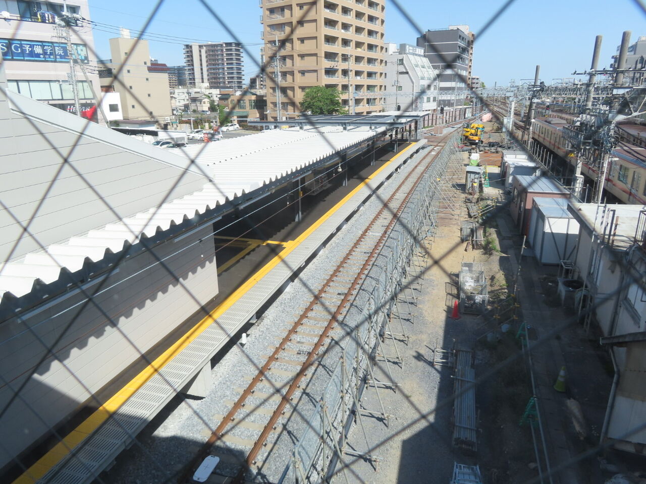 そしてこちらは下り方。仮線切り替え直後は繋がっていなかった、仮線からの渡り線がすごい曲線を描いて4番線方向に伸びています。
