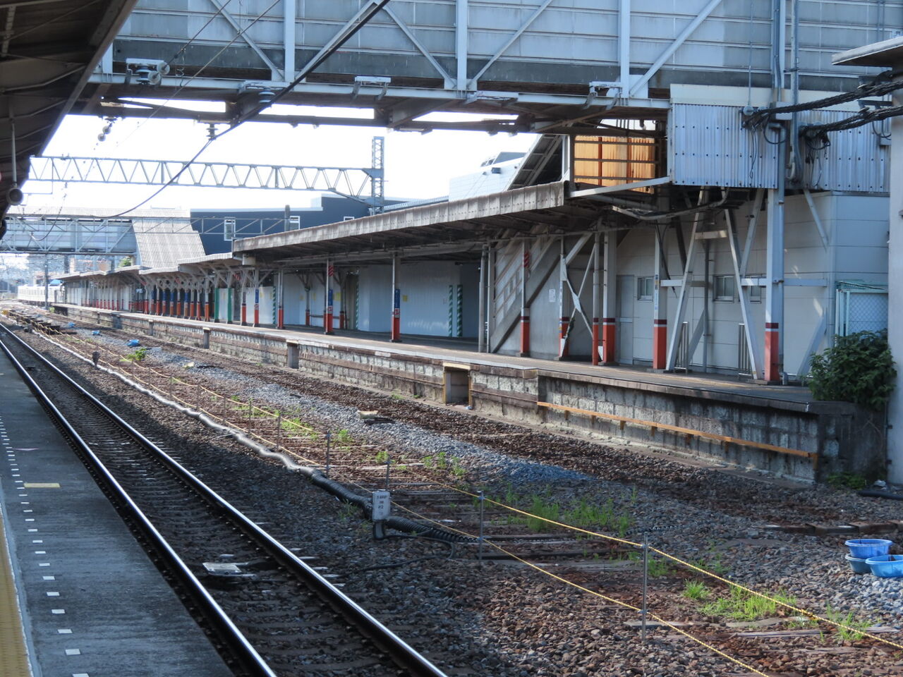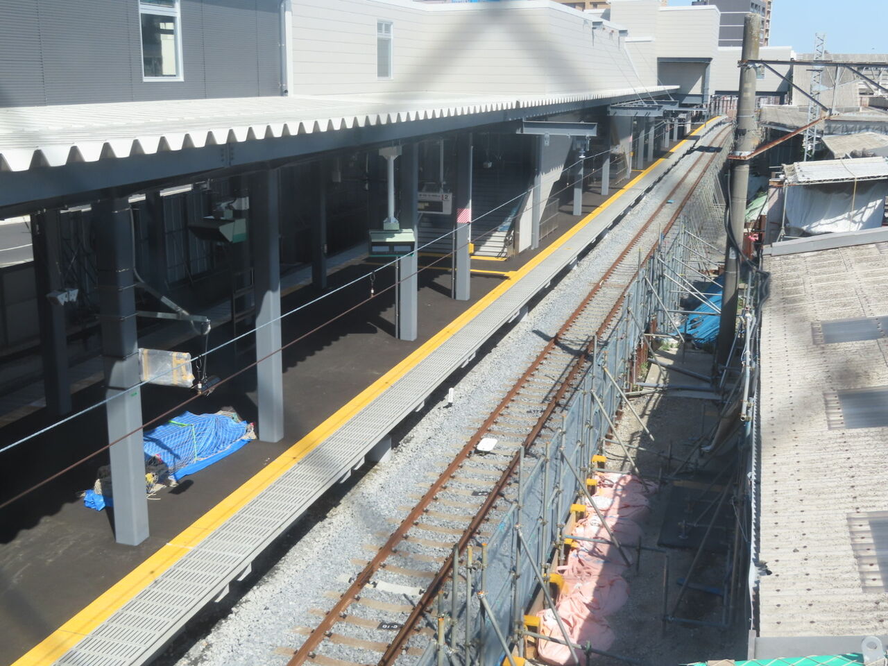線路は撤去されましたが、旧1番線ホームはまだ残っています。解体にはどれぐらいの時間がかかるんでしょうかね。壊すのは比較的簡単でしょうけど、営業線に挟まれてますし、廃材の搬出するのに時間かかりそう。
