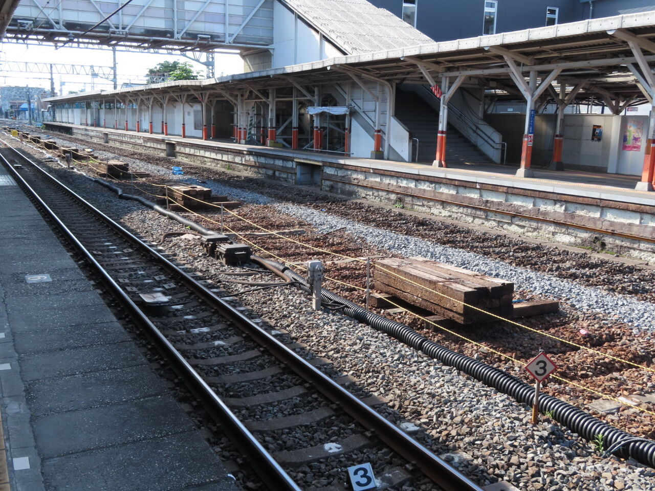 枕木も木製のものは剥がされてまとめられていました。しかしいくら2番線に営業列車が入らないとは言え、ずいぶん古そうな枕木を使用していたんですね。