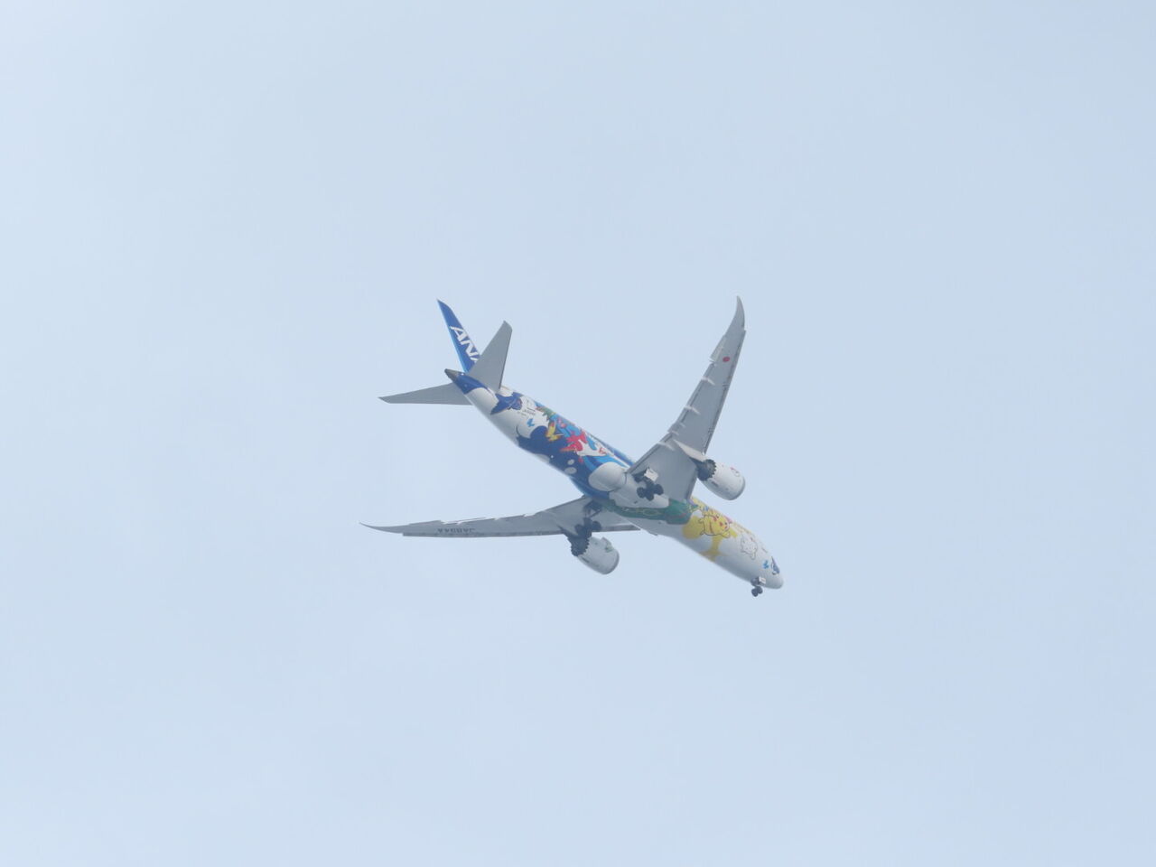 羽田着陸便が結構低い位置を飛ぶ原宿。上を見上げると、なんか他と違う感じの飛行機が見えたのでカメラを向けると、ポケモンジェットでした。下から見るのはなかなかレア?